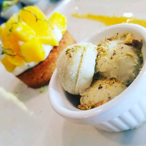 Fresh Mango and Orange Fruit Pie with Pistachio Gelato